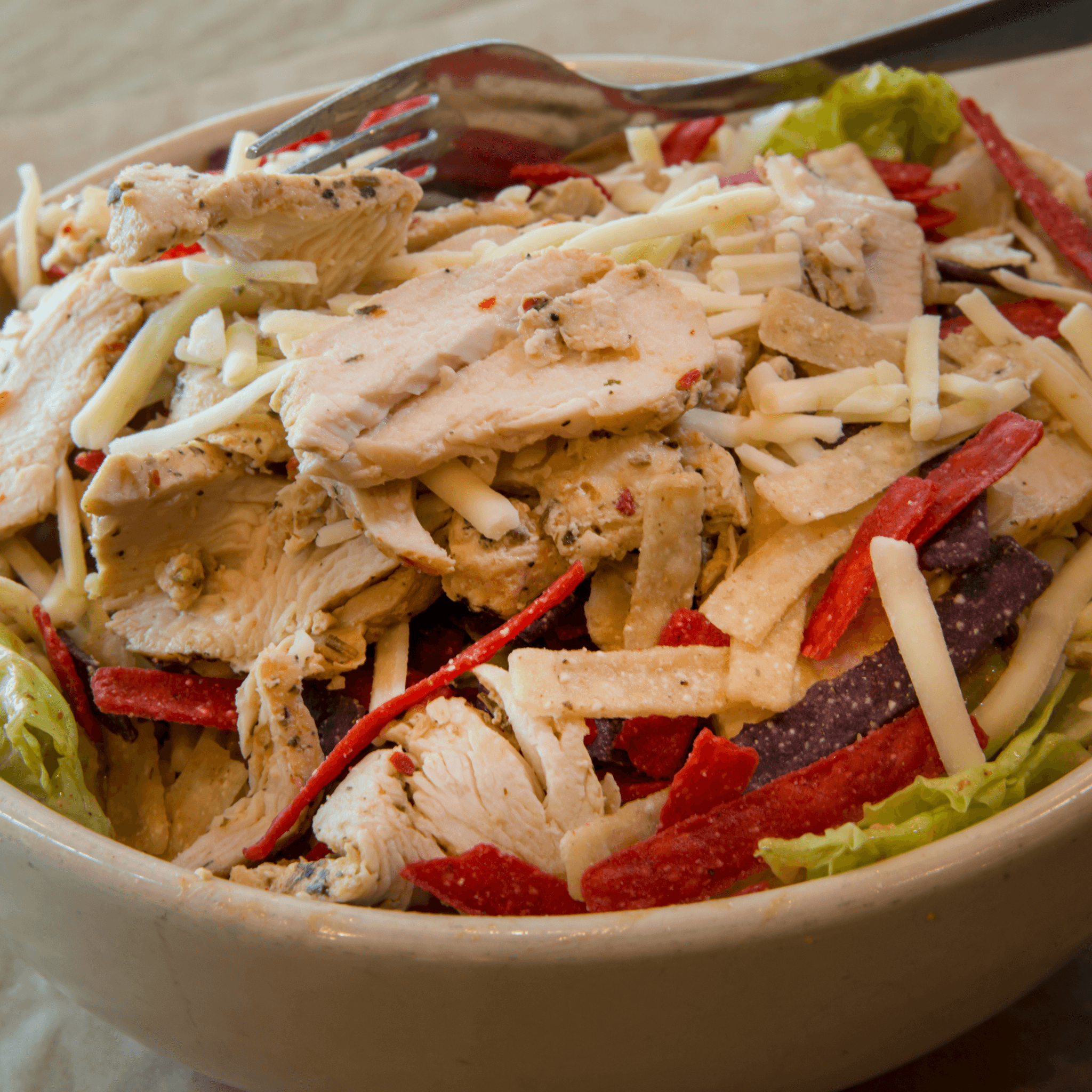 All-natural and antibiotic-free chicken, pepperjack cheese and crispy tortilla strips paired with our slightly spicy chipotle caesar dressing.