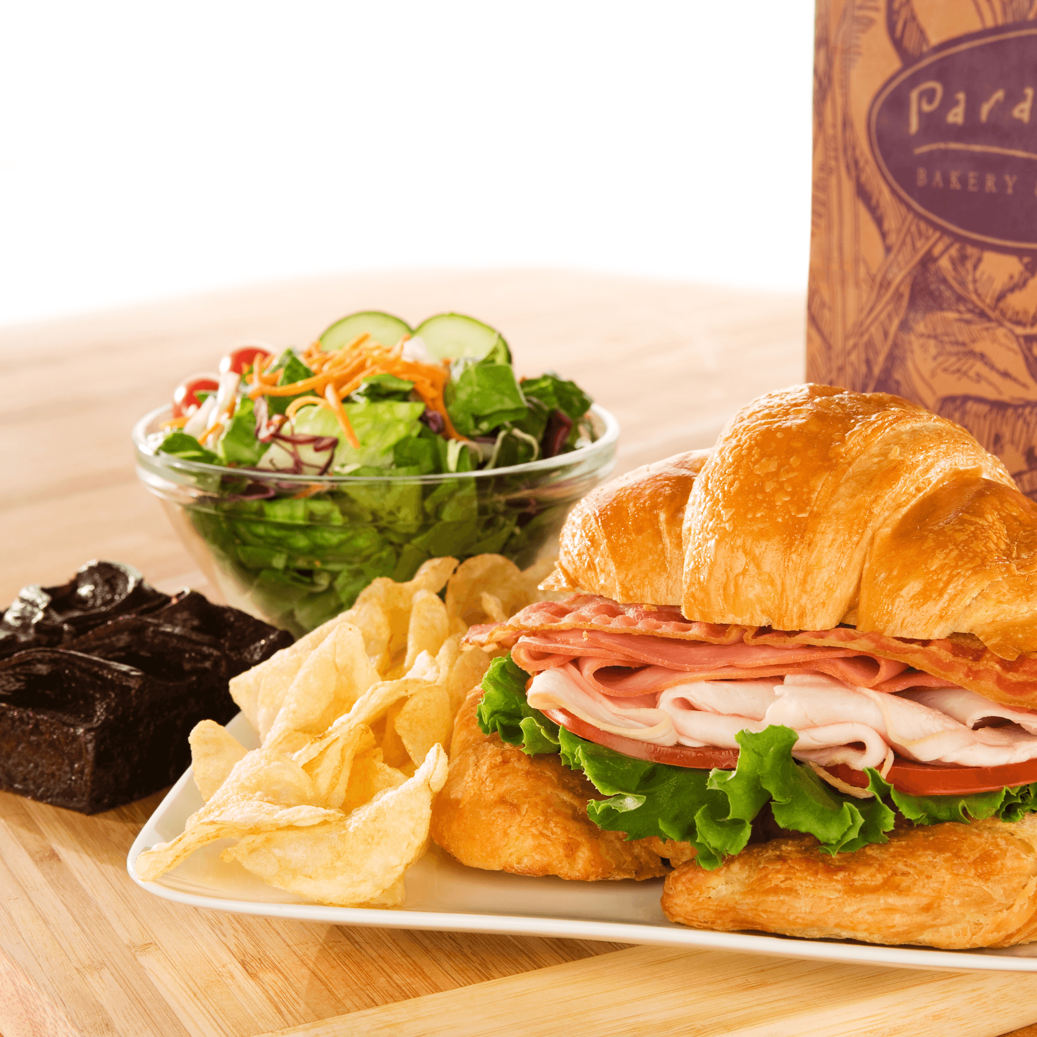 Choose from any of our bakery fresh sandwiches or great salads. Lunch includes a bakery fresh sandwich, mixed green side salad, potato chips and your choice of fudge or cream cheese brownies.