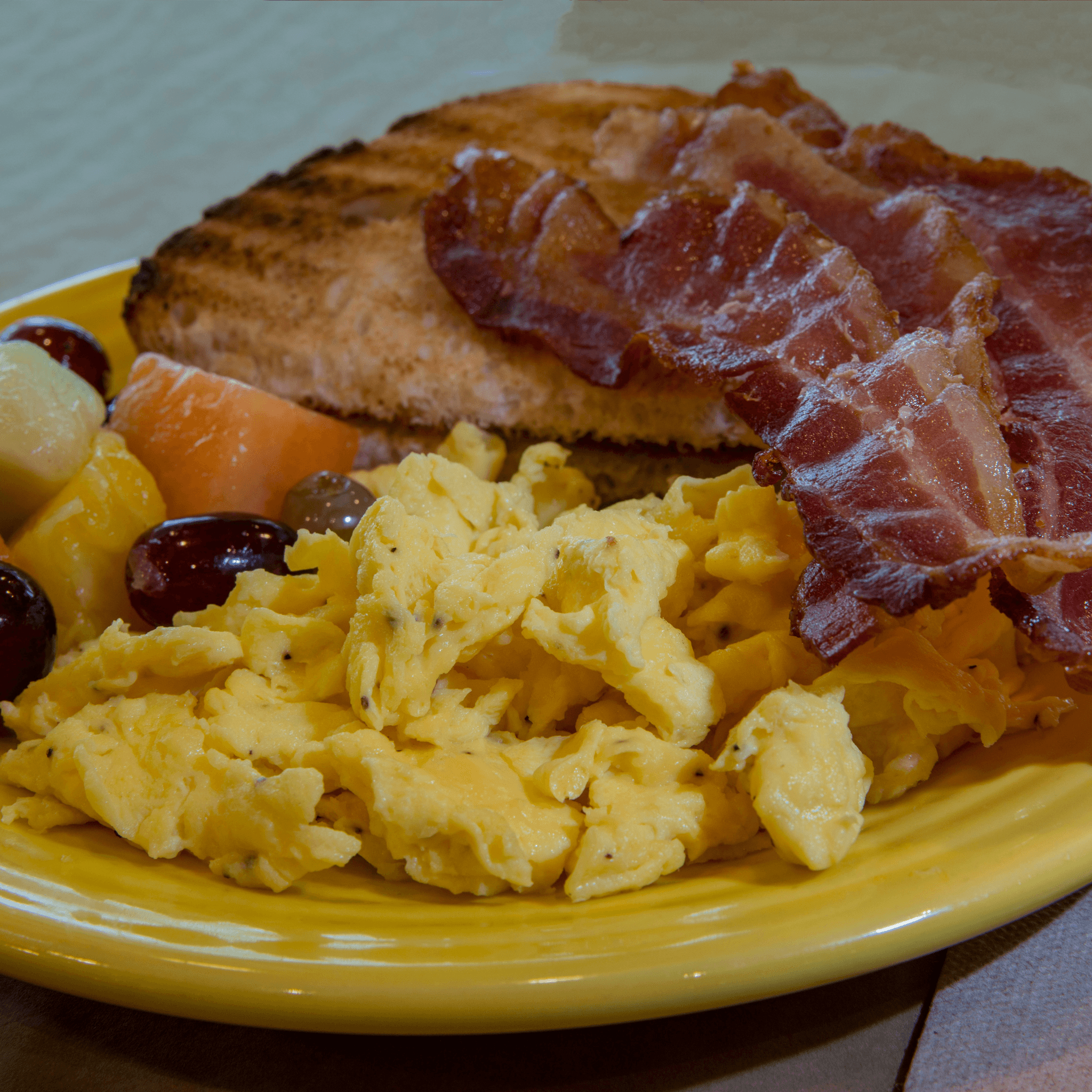 2 scrambled eggs with 2 strips of bacon and a ramekin of fresh fruit. Served with sourdough toast