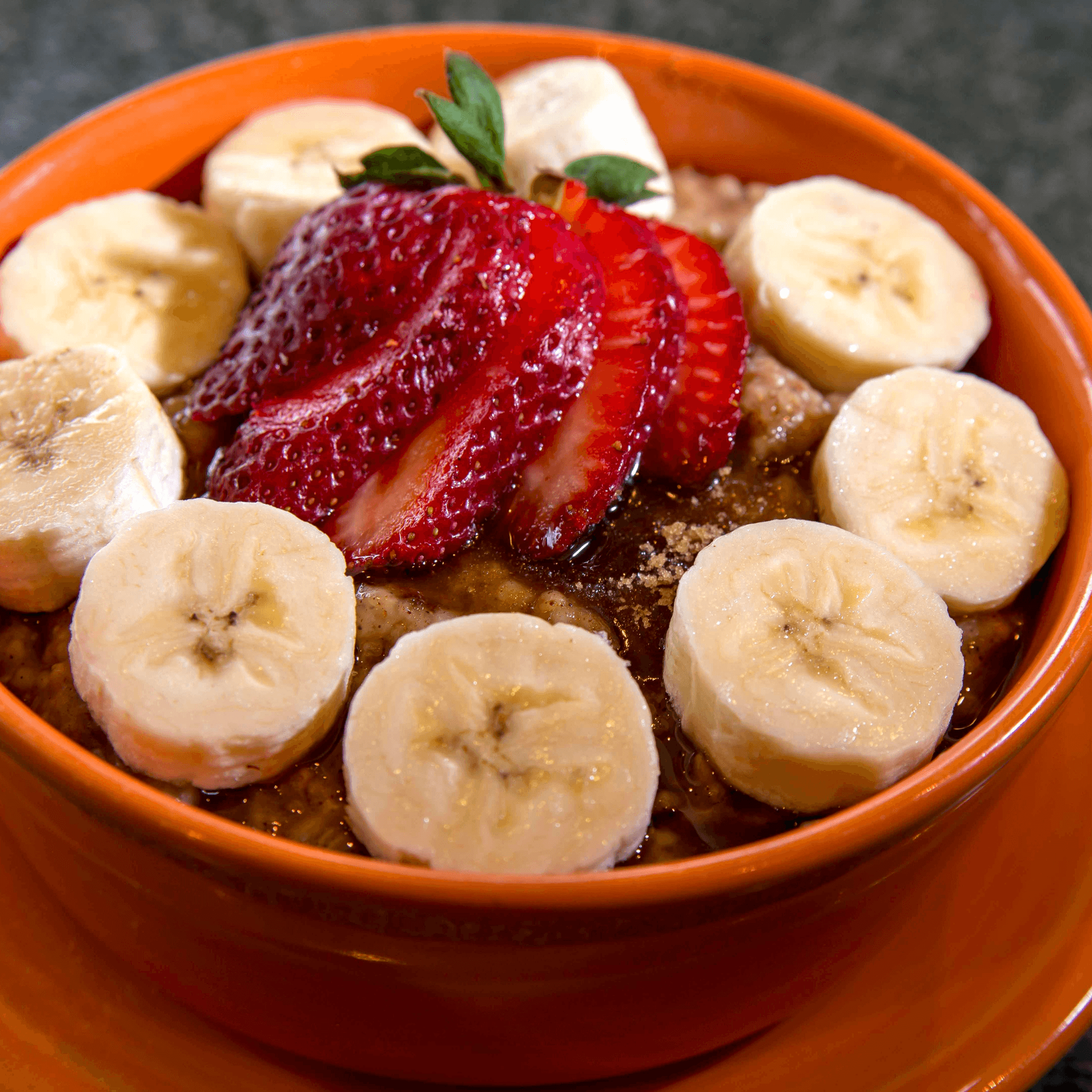 Irish steel cut whole grain oatmeal with hints of cinnamon, nutmeg and honey. Served in an oatmeal raisin cookie bowl and topped with strawberries, bananas and brown sugar