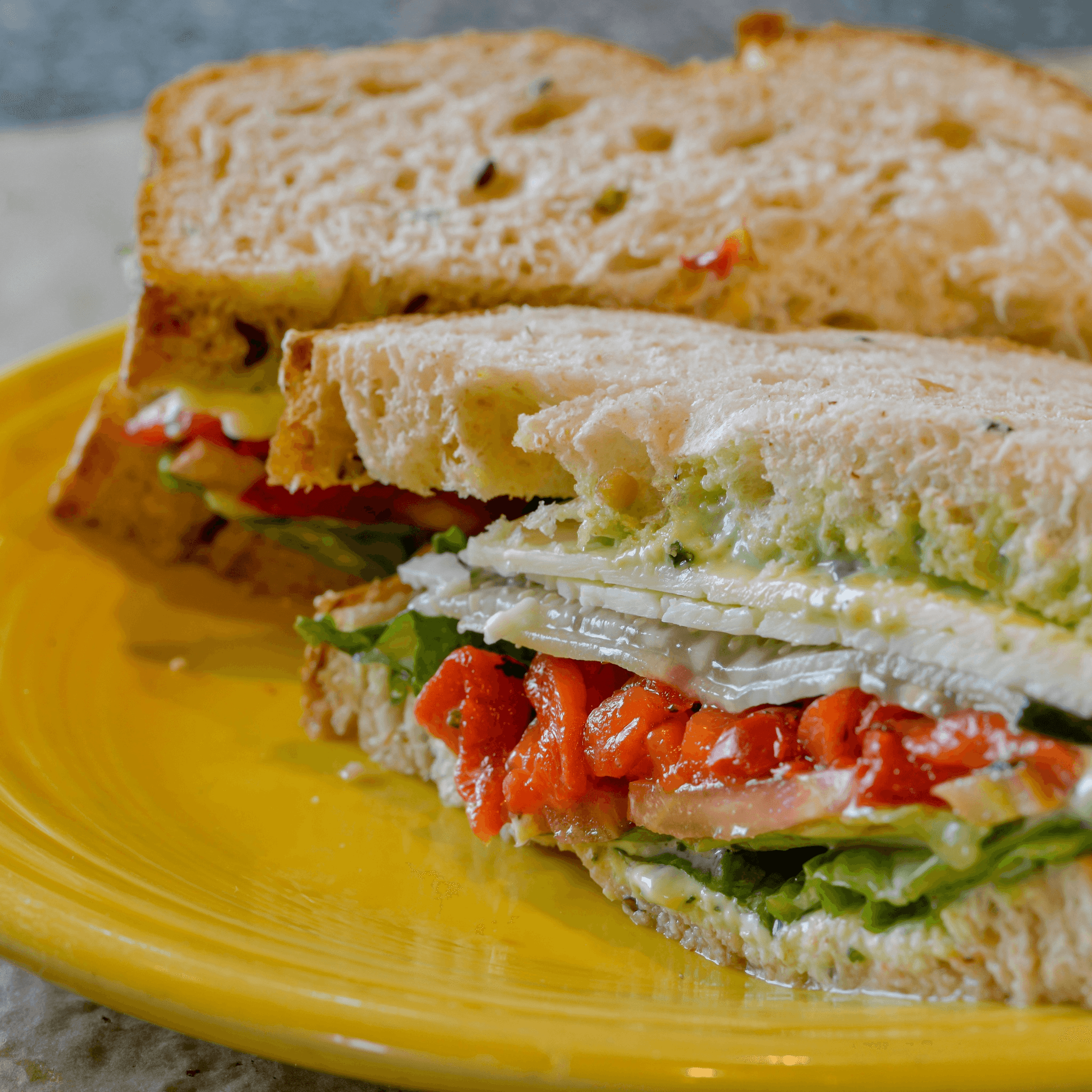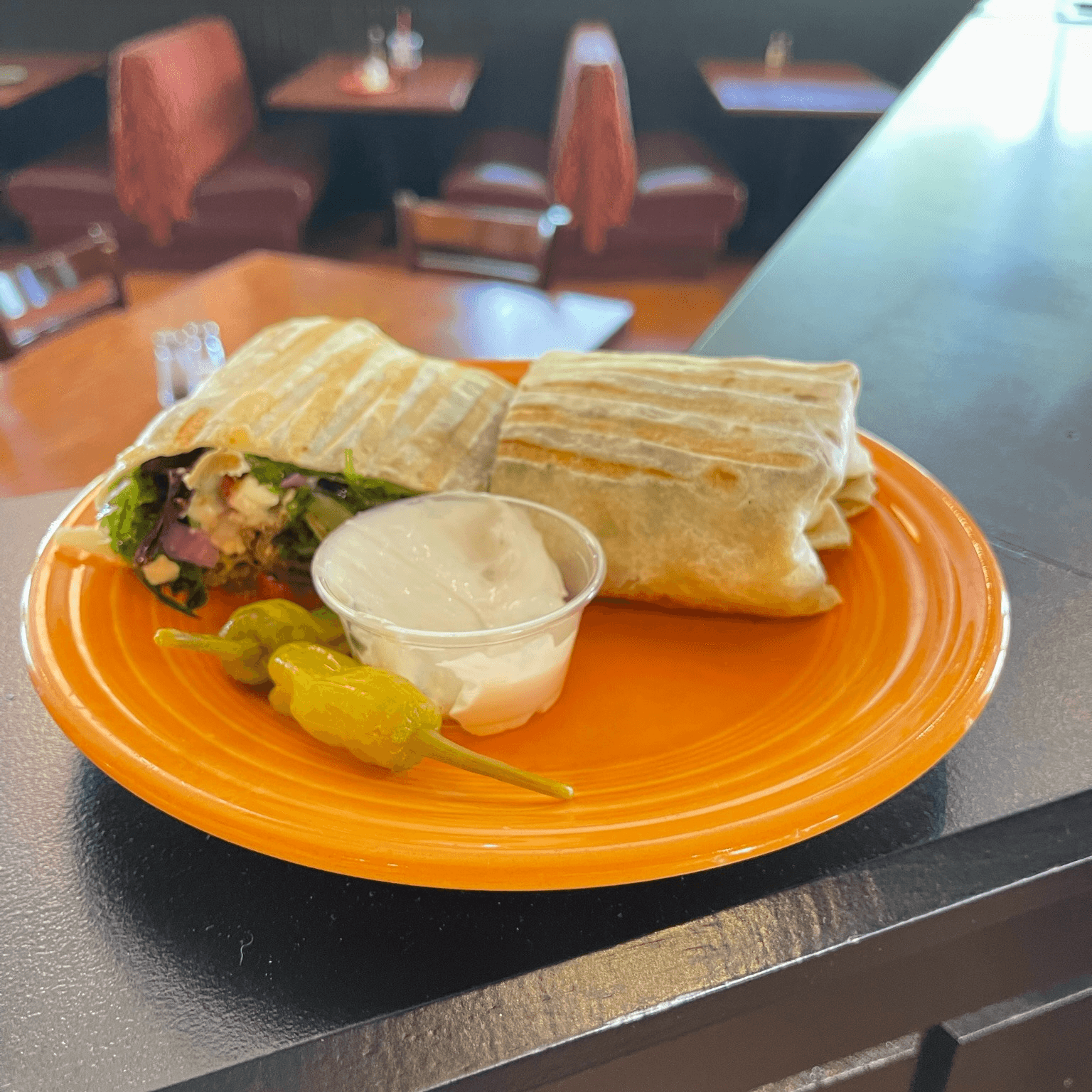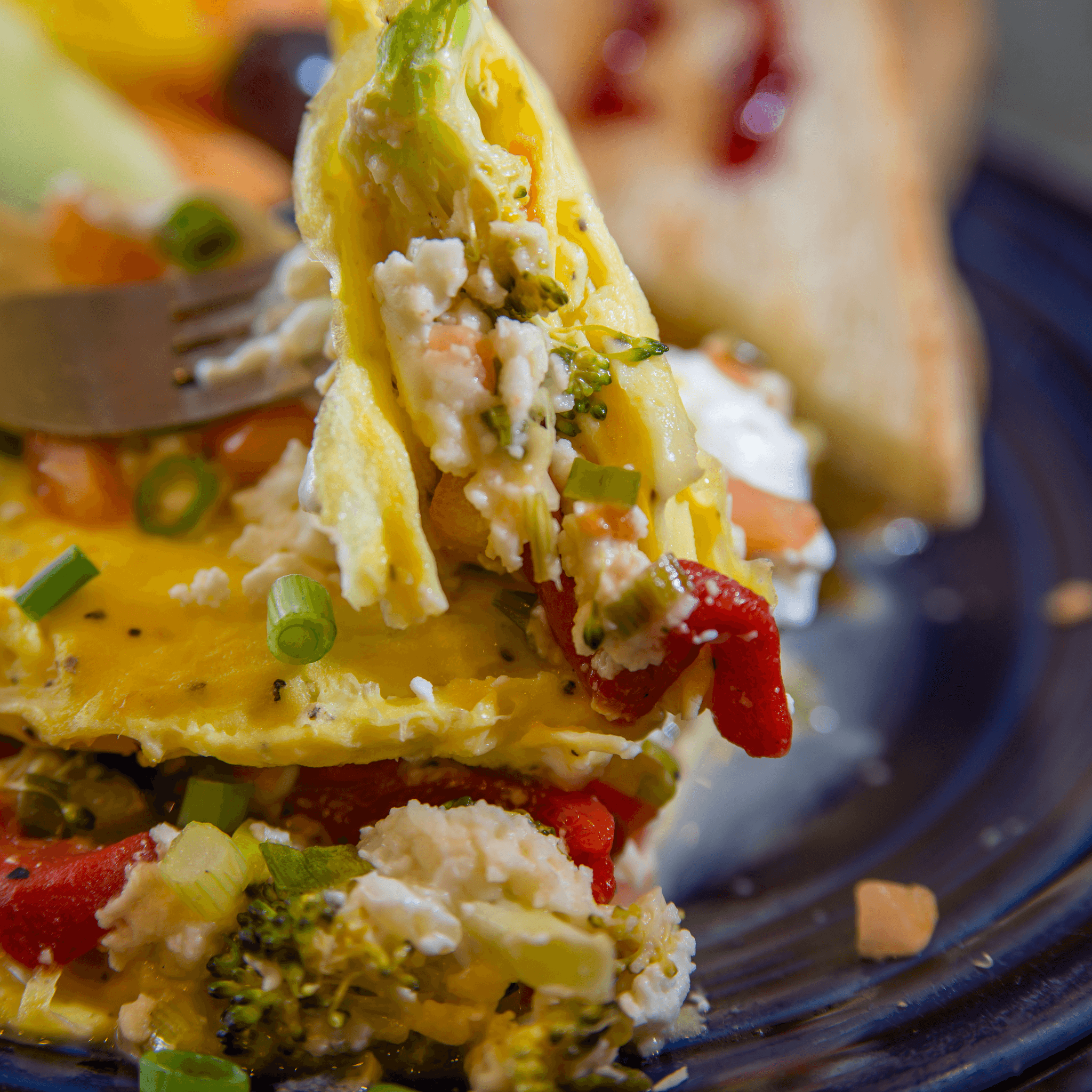 3 egg omelet filled with tomatoes, red bell peppers, broccoli and feta cheese. Topped with garlic sour cream, green onions and chopped tomatoes. Served with sourdough toast and a ramekin of fruit
