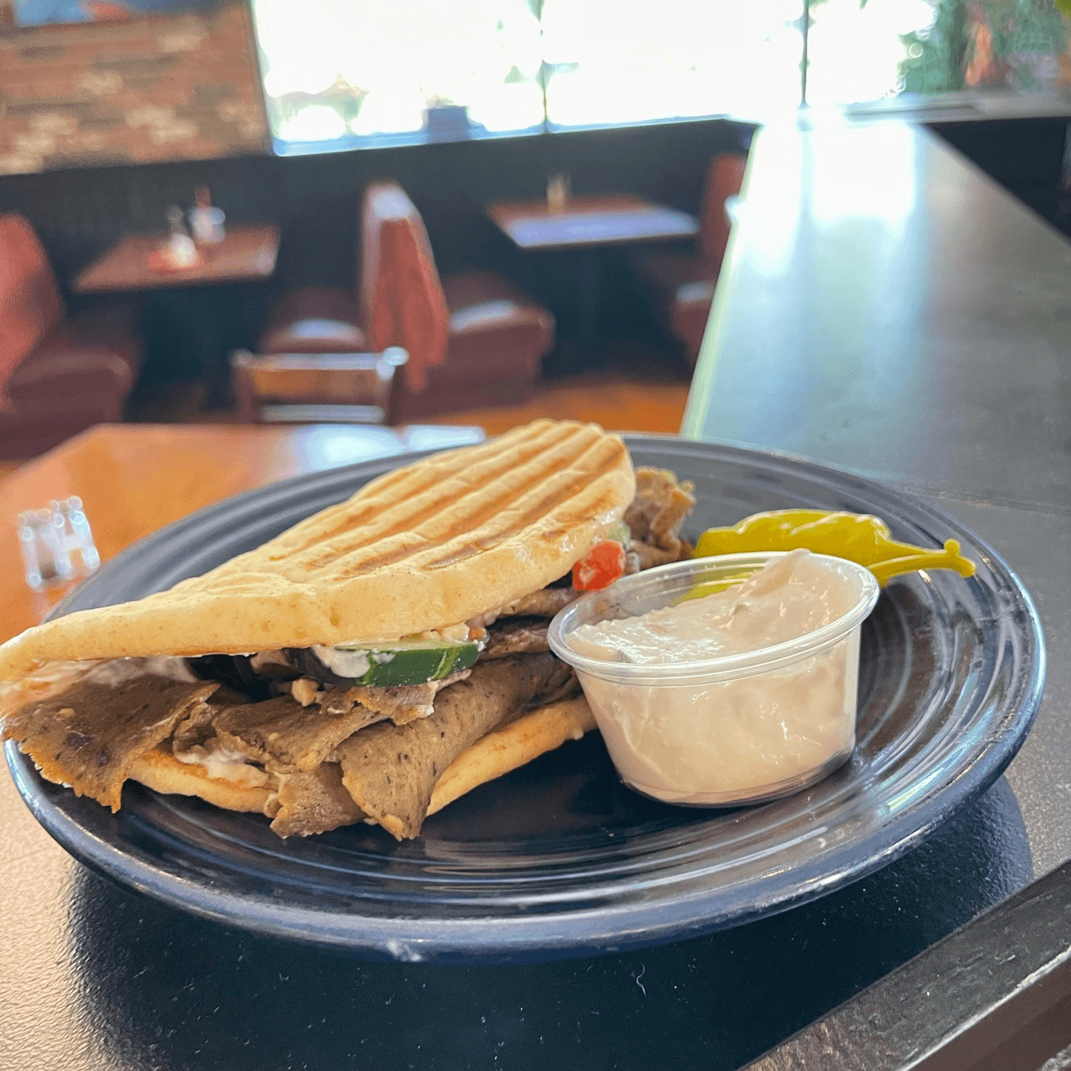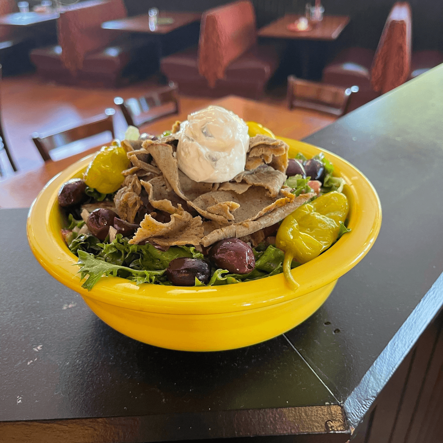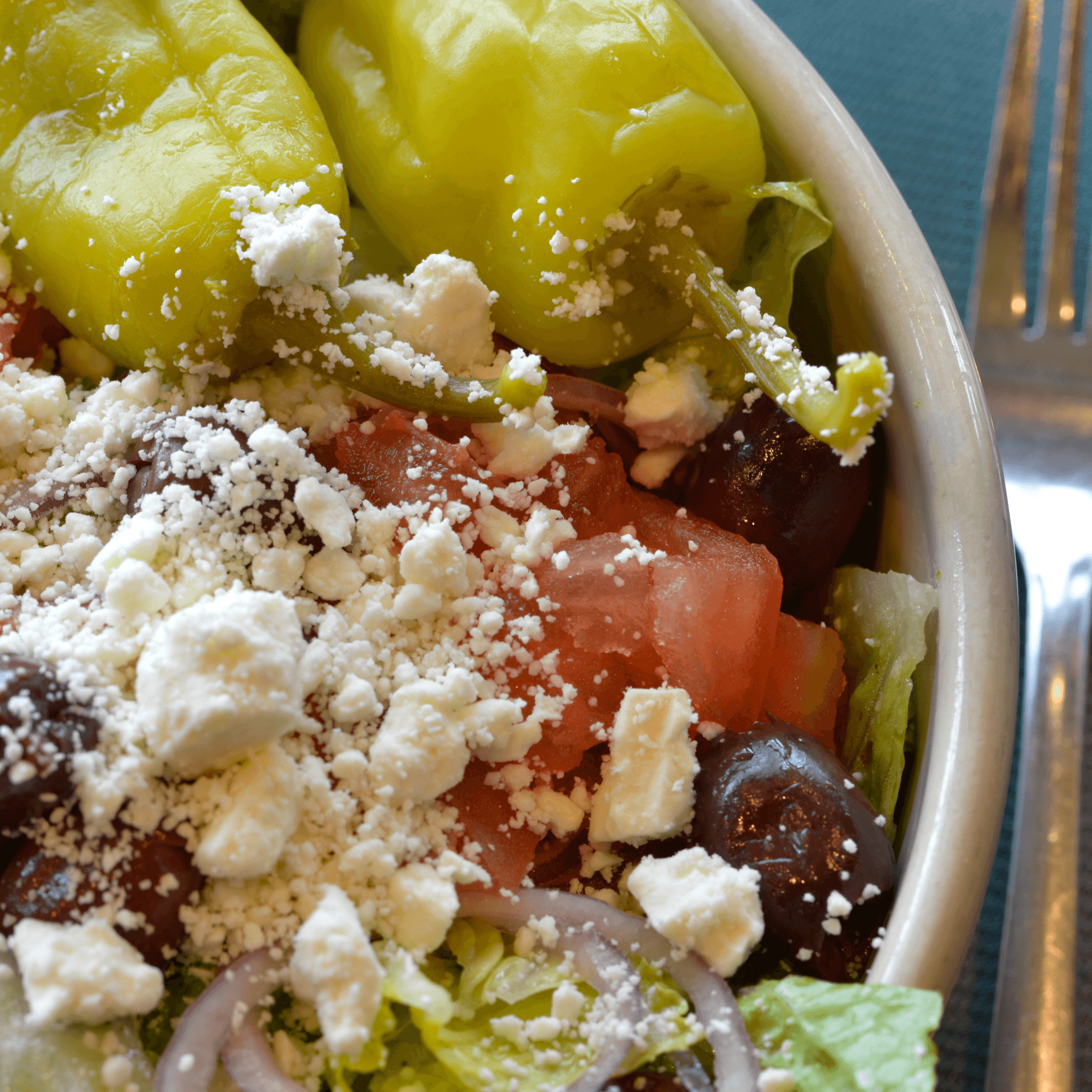 Romaine lettuce with sweet red onions, Kalamata olives, feta cheese, tomato wedges and pepperoncinis with Greek dressing.