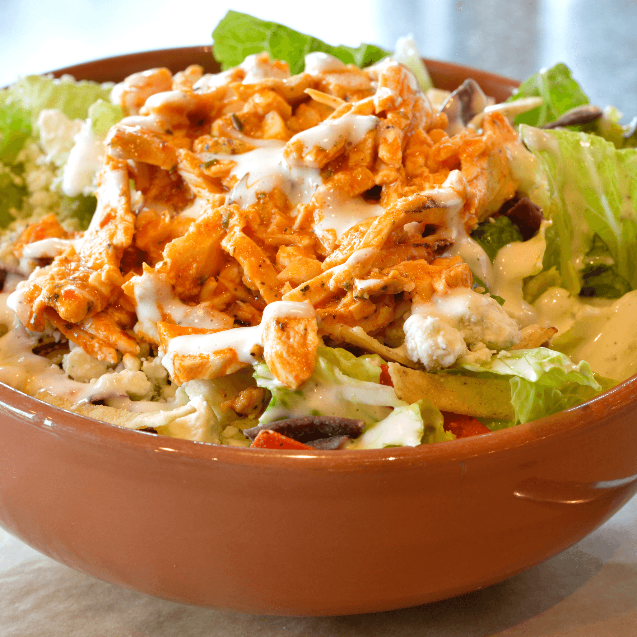 All-natural and antibiotic-free chicken tossed in buffalo sauce with bleu cheese and crispy tortilla strips paired with our homemade buttermilk ranch.