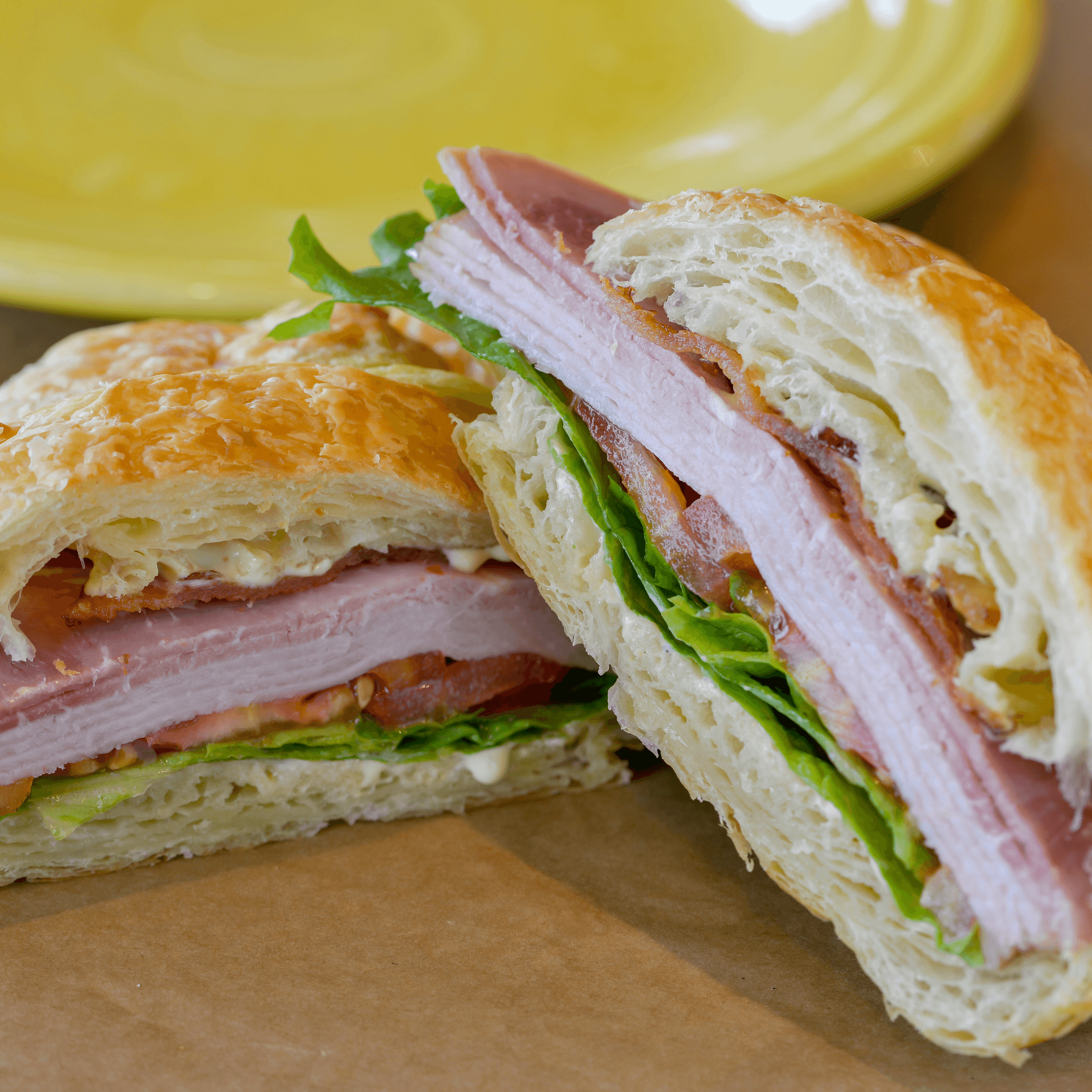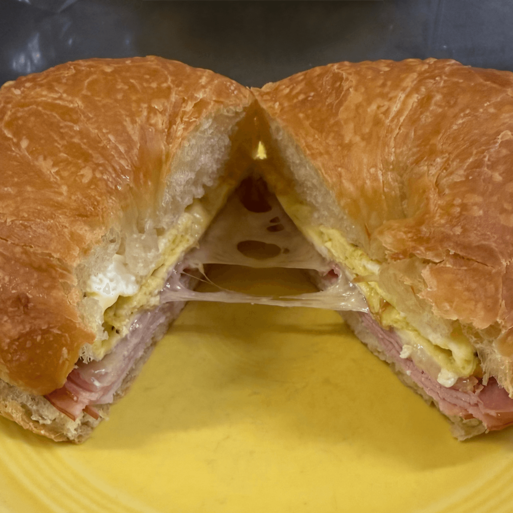 Scrambled eggs, sliced cured ham and swiss cheese on our fresh buttery croissant