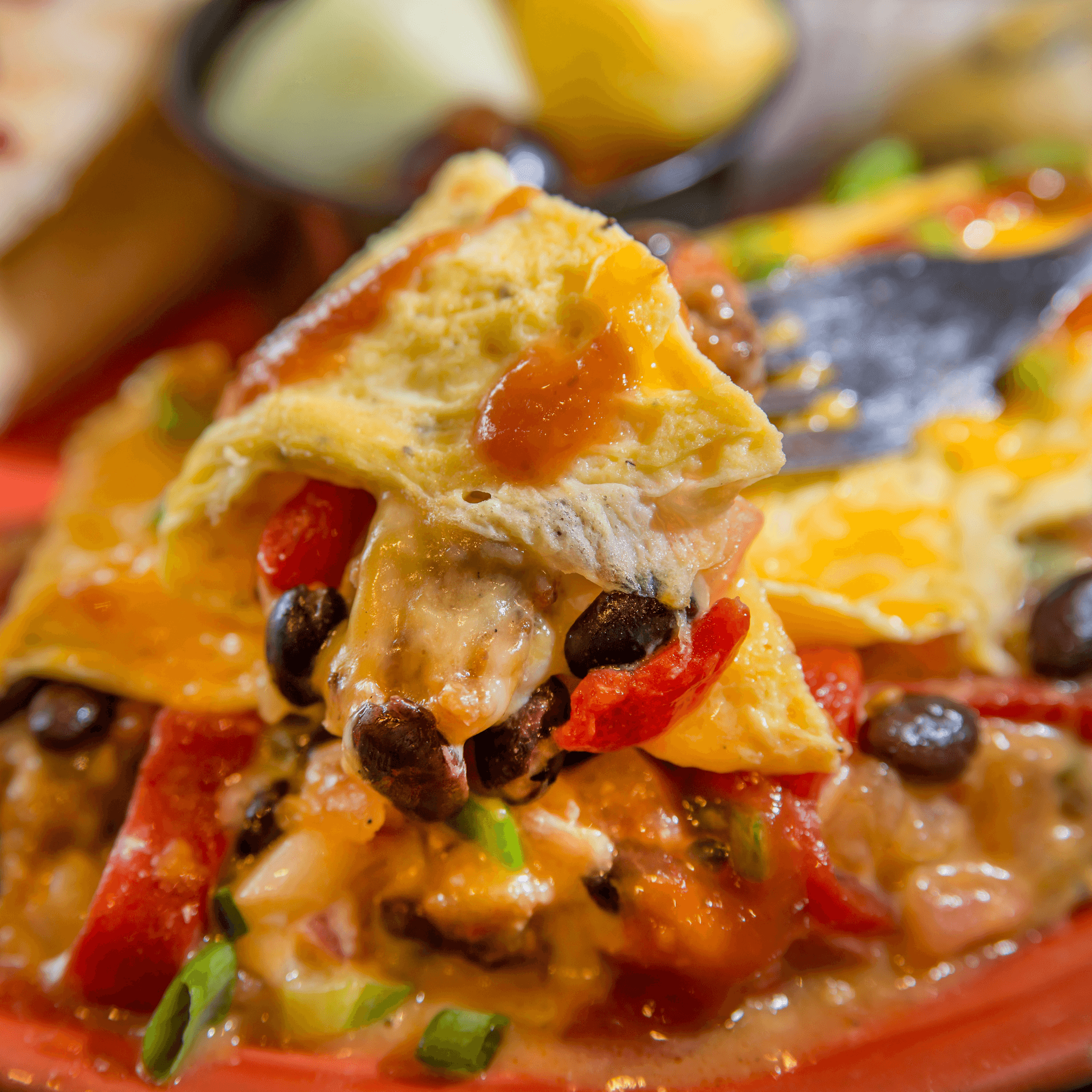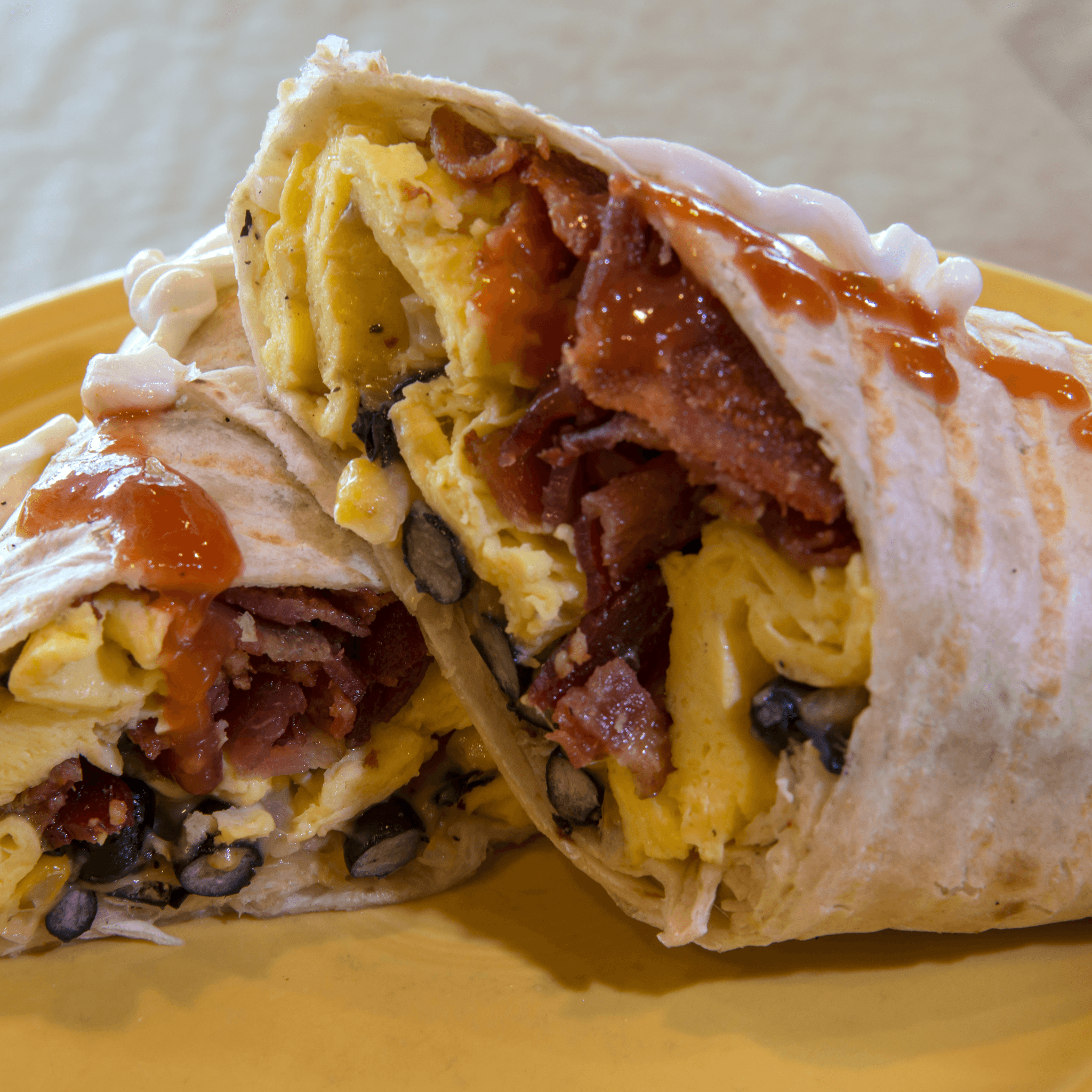 Scrambled eggs, smoked bacon, black beans, roasted corn with jicama and cheddar cheese wrapped in a traditional flour tortilla