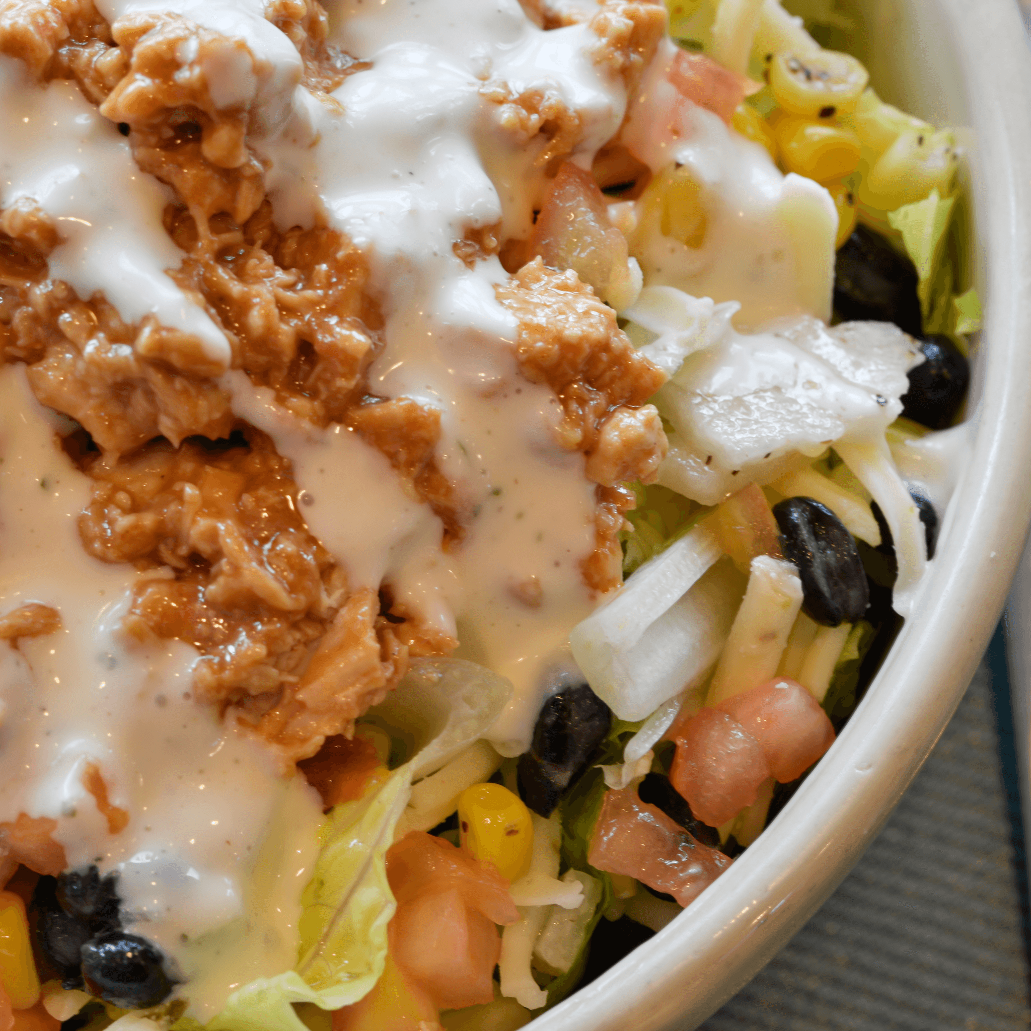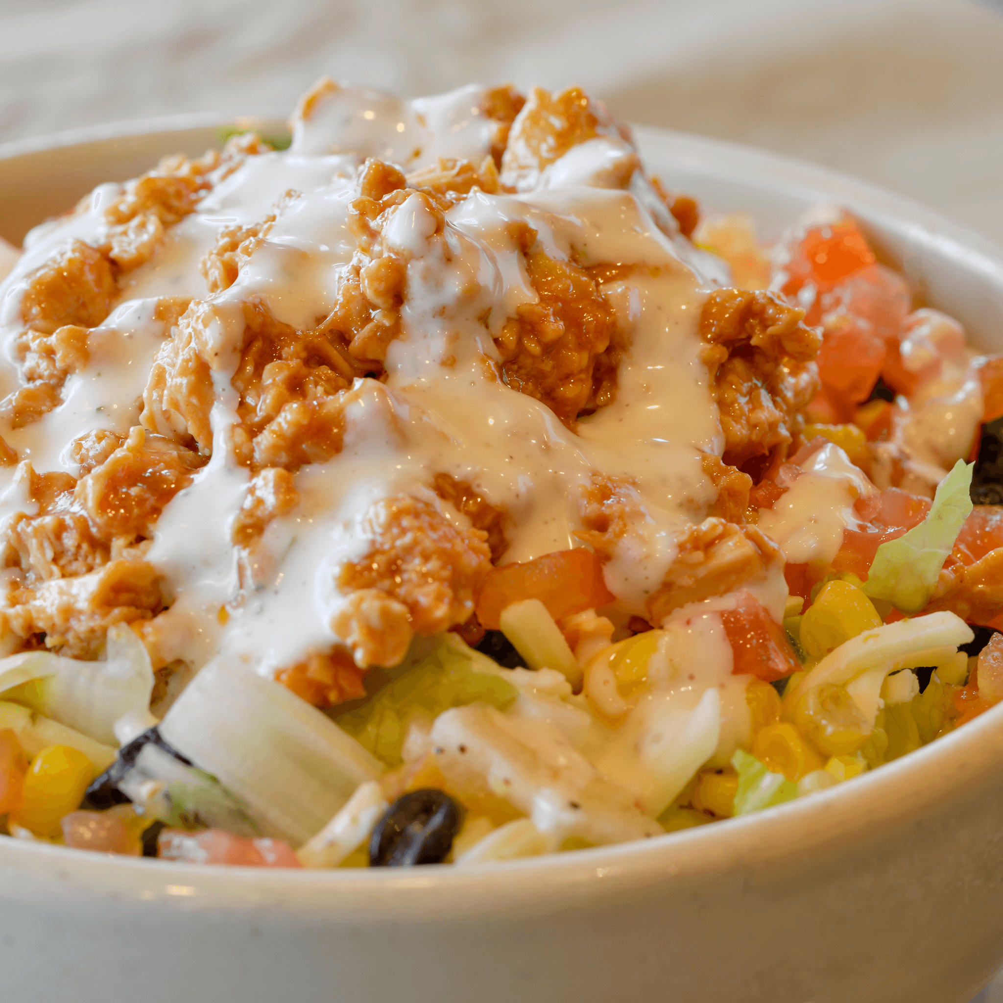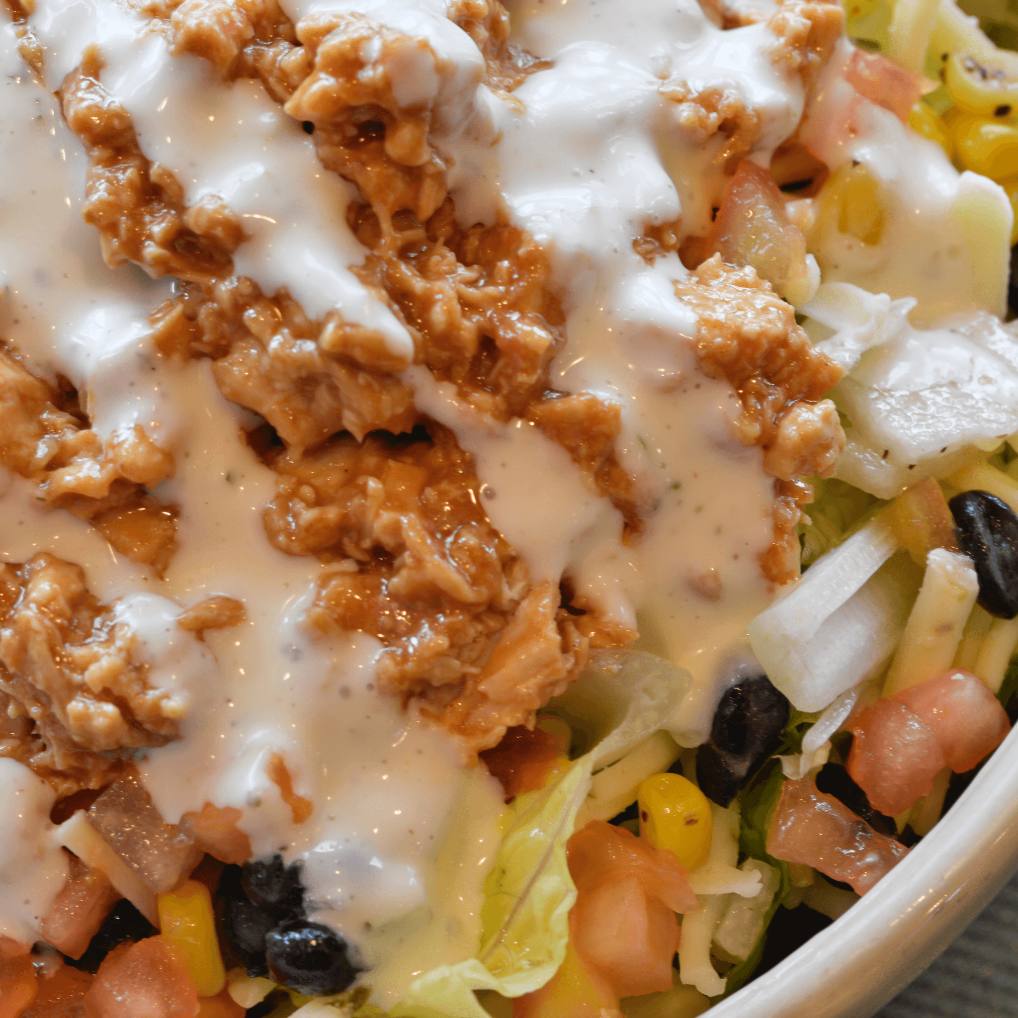 All-natural and antibiotic-free chicken tossed with barbecue sauce and topped with roasted corn, black beans, pepperjack cheese and tomato paired with our homemade buttermilk ranch.