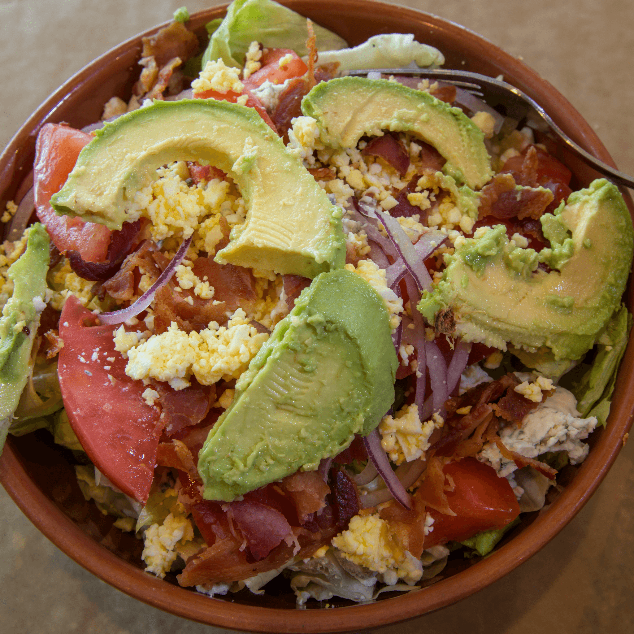 Fresh sliced avocado, bacon, bleu cheese, tomato, red onion and egg paired with a mix of buttermilk ranch and balsamic vinaigrette.
