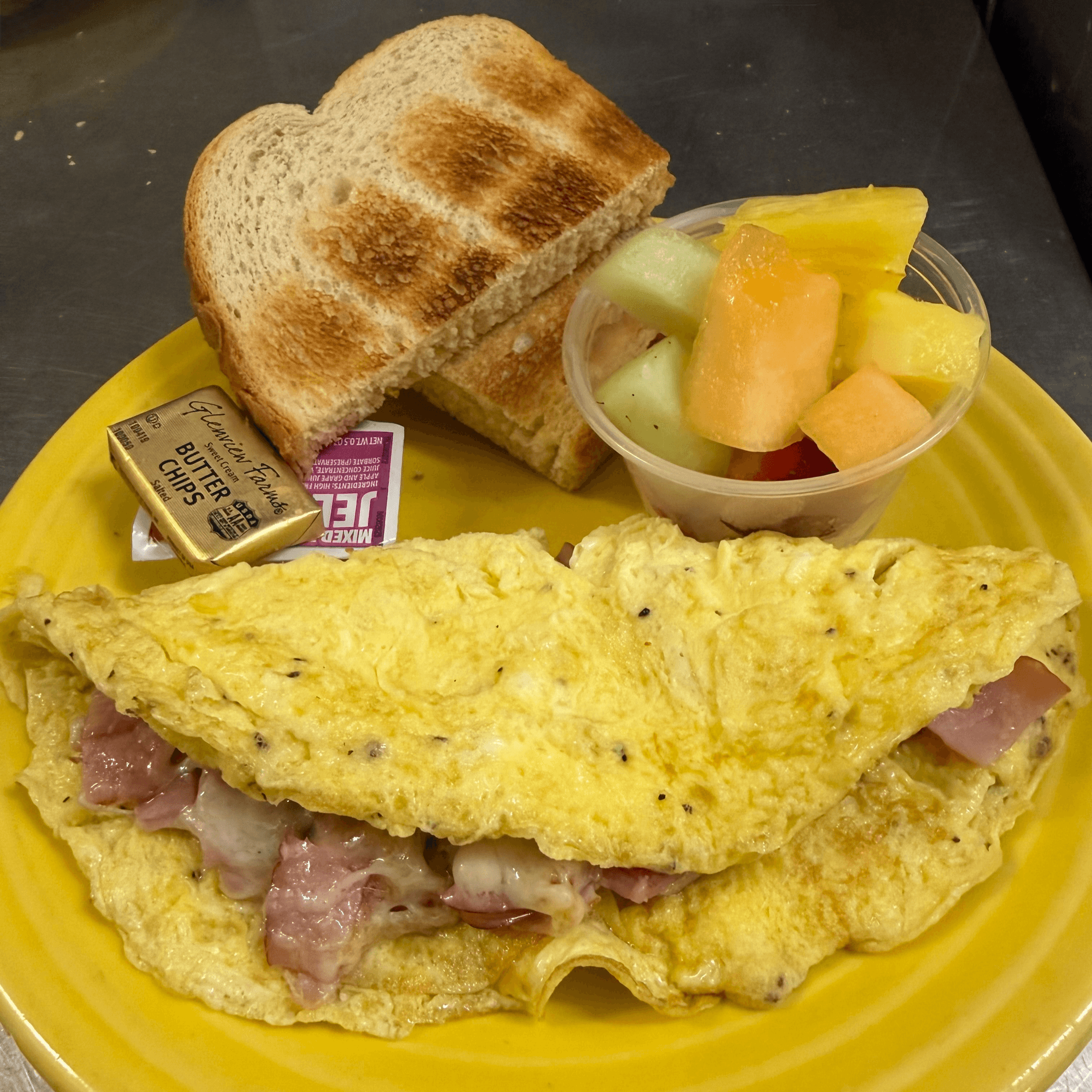 3 egg omelet filled with diced ham and cheddar cheese, topped with cheddar cheese. Served with sourdough toast and a ramekin of fruit