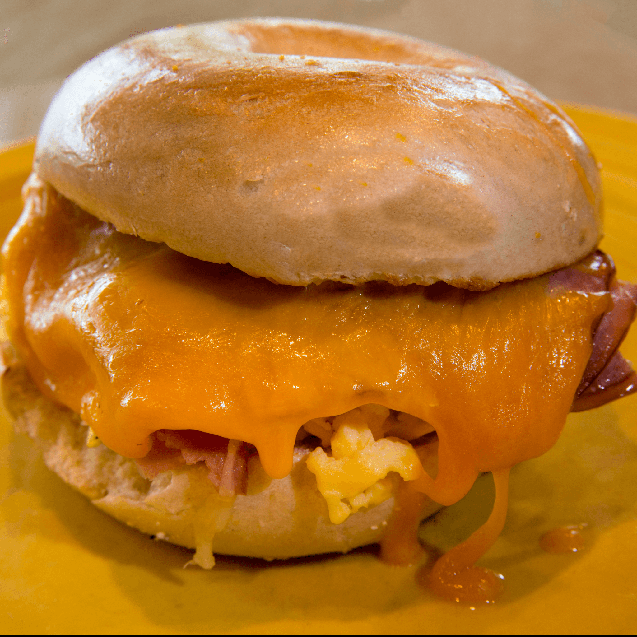 Scrambled eggs, ham and cheddar cheese on a plain bagel