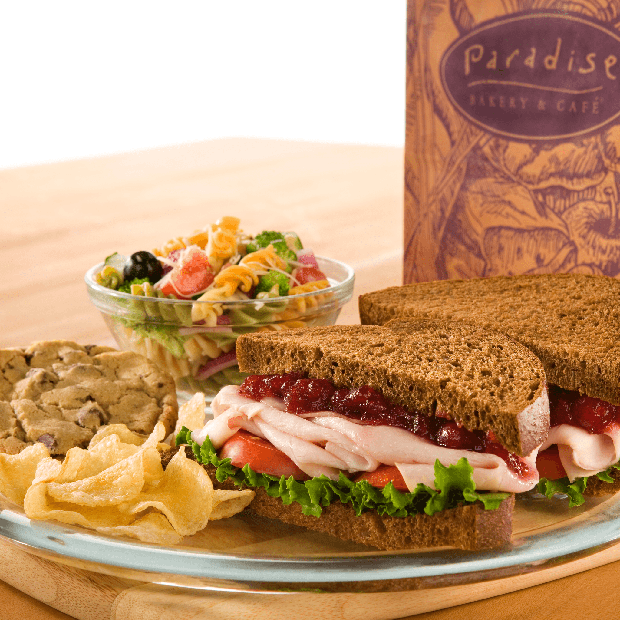 Choose from any of our bakery fresh sandwiches or great salads. Lunch is packed with a side of paradise pasta salad, potato chips and our award-winning chocolate chip cookie.