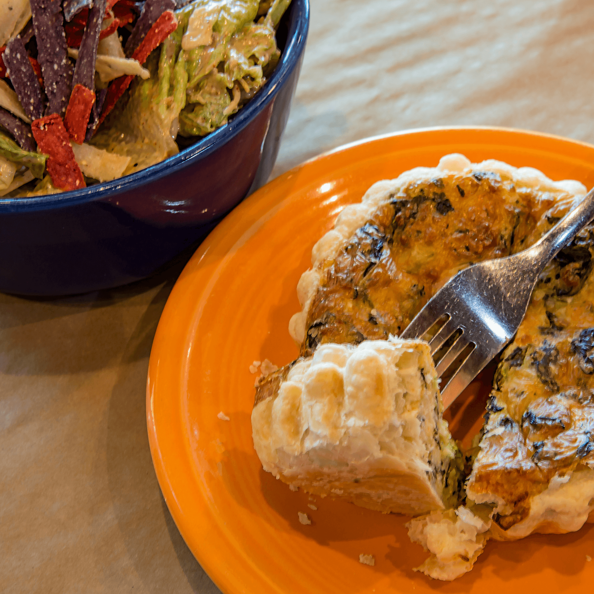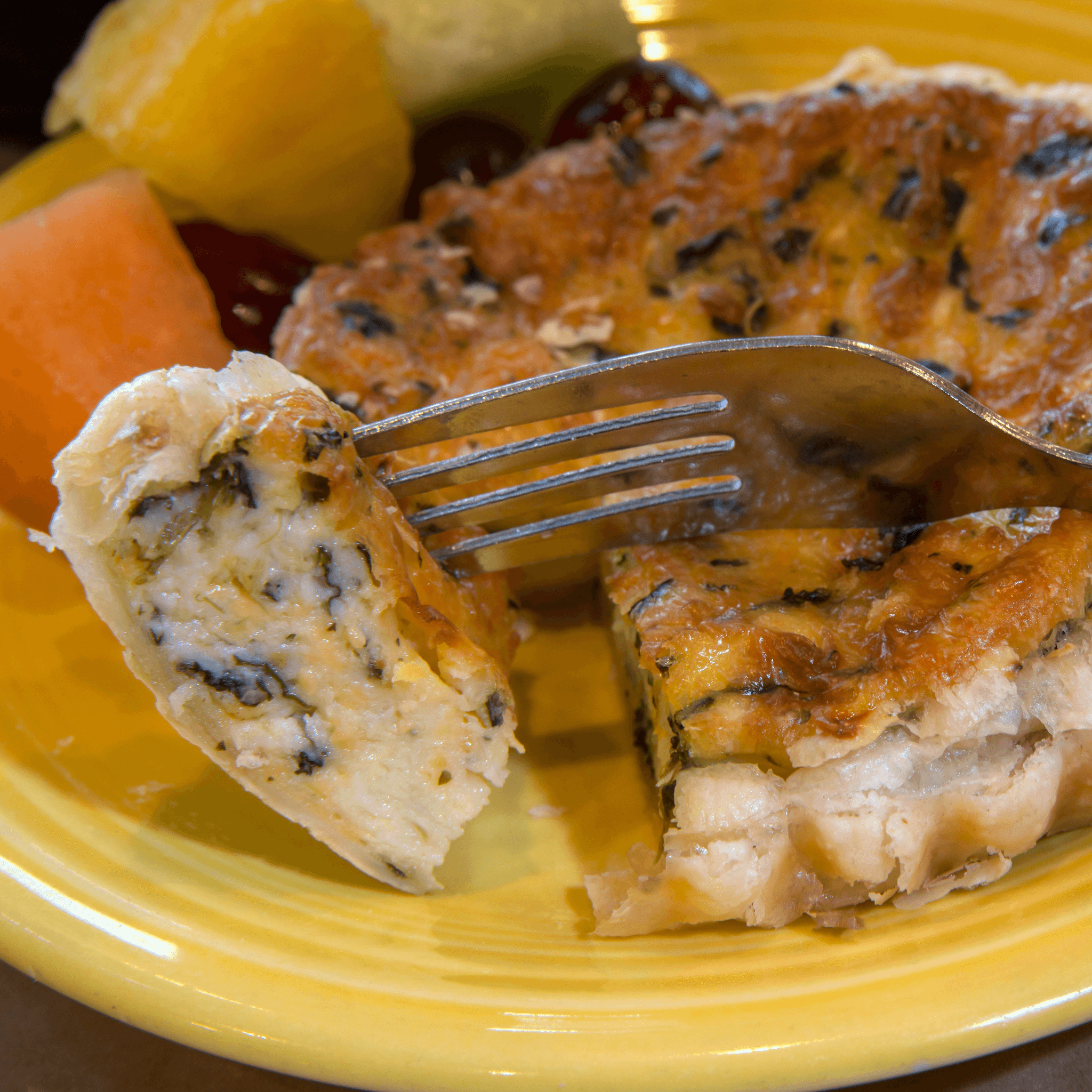 Spinach, cheddar jack cheese and parmesean quiche in a puff pastry crust served with fresh fruit